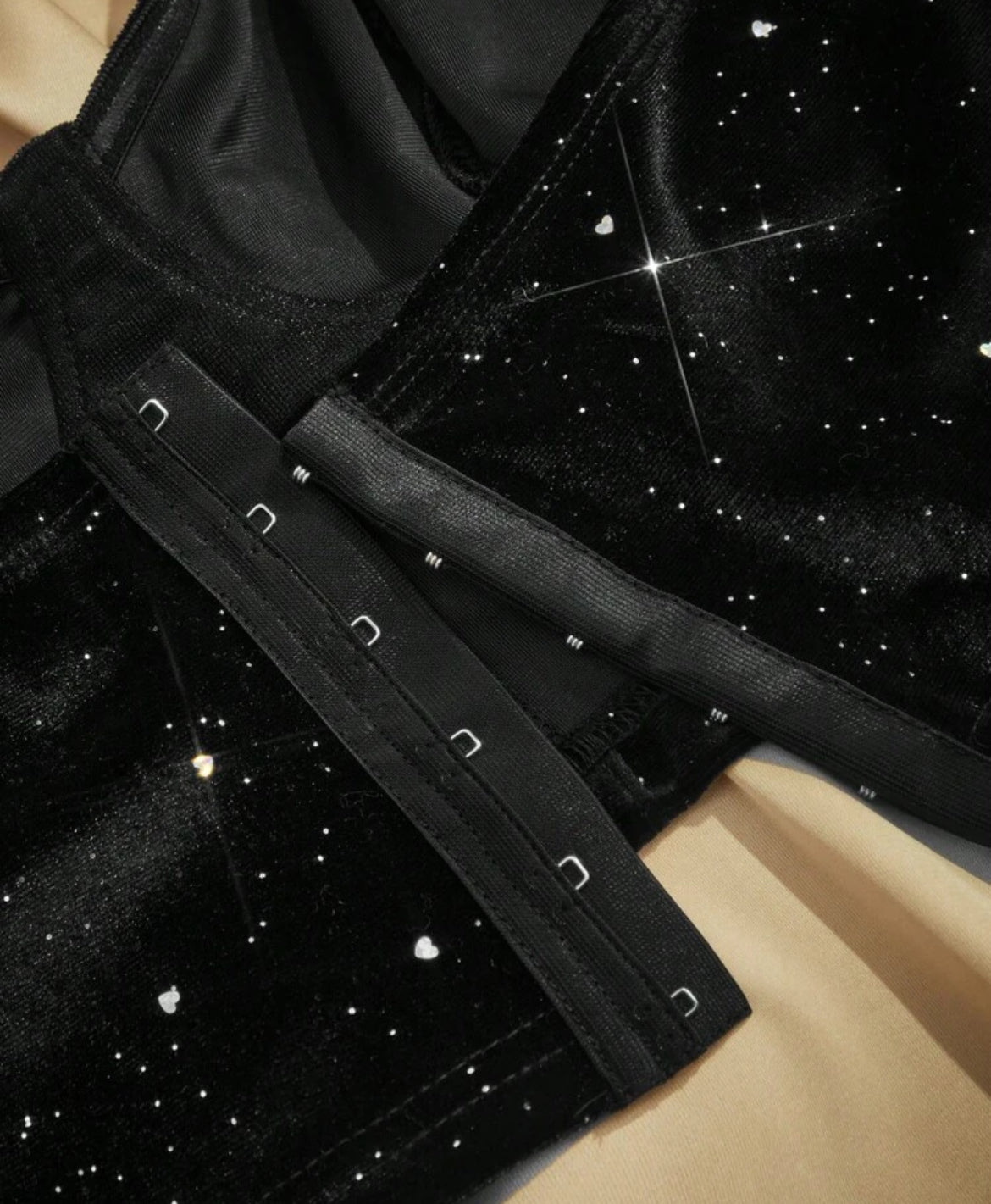 The Galaxy cropped corset top features a luxurious velvet fabric adorned with rhinestones, designed specifically for evening wear. This sophisticated top enhances body contour, providing a form-fitting silhouette that is both flattering and stylish for nightlife occasions. The use of rhinestones adds a touch of elegance, making it suitable for upscale events.