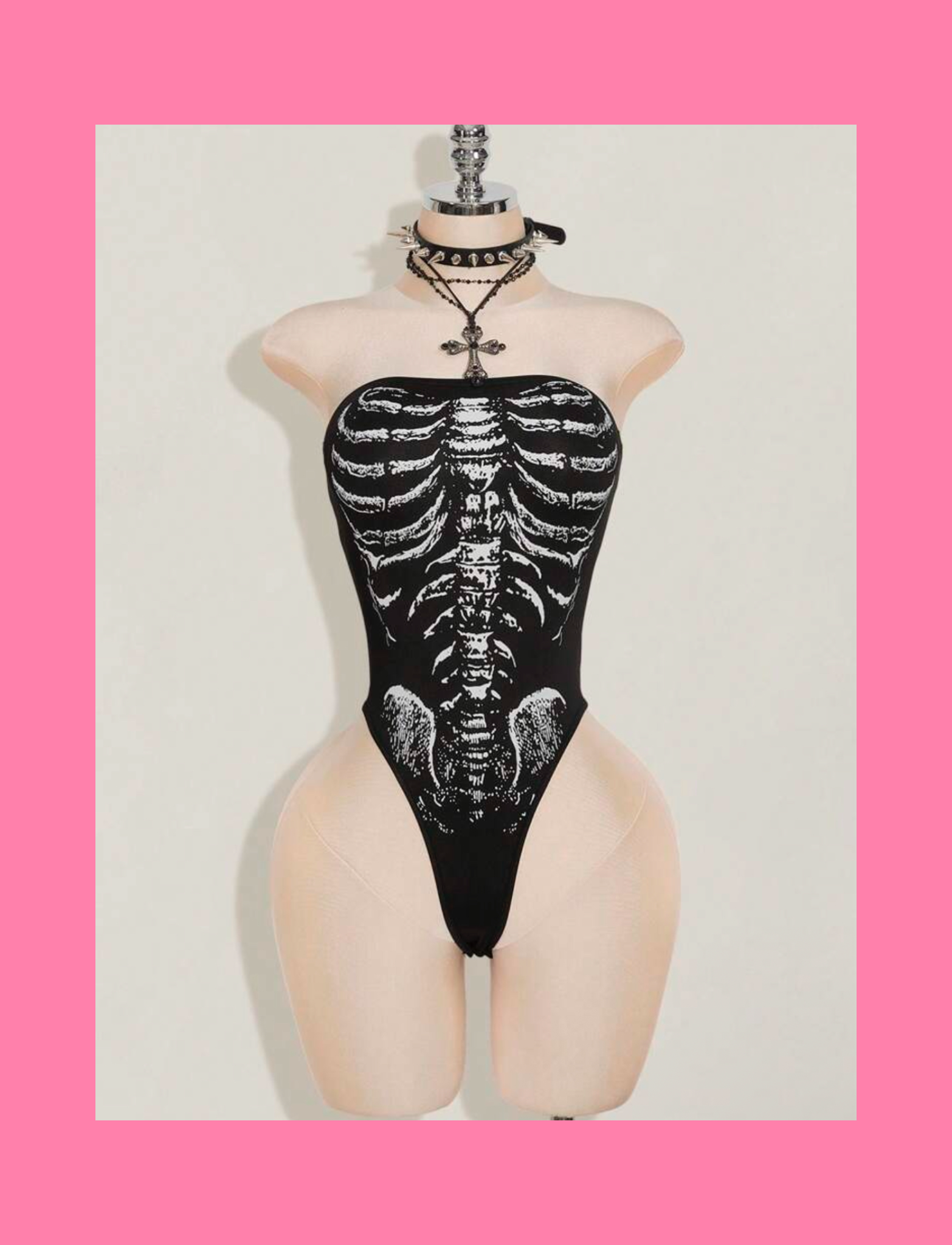"Get in the spooky spirit with our Skin & Bones bodysuit! This strapless bodysuit features a skeleton design perfect for Halloween. Show off your playful side while looking chic. No bones about it, this bodysuit is a must-have!"